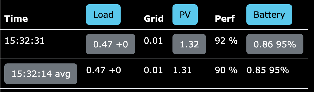 - Load, Grid, PV (Photovoltaic = Solar Panel Production) and Battery: Measured in kilowatts (kW). Battery level is indicated as a percentage.